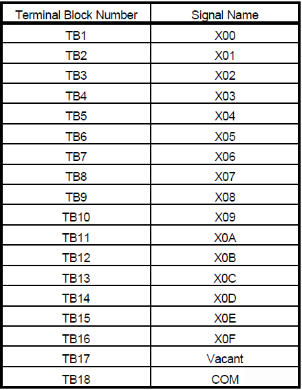 QX80 DC总共有16路输入通道;工作电压为DC24V;最大输入电流为4mA;可连接18点末端接线模块(Terminal Block),编号为TB1~TB18,其中TB18为公共端(负极)。当所有的通道都接通时,消耗基板5V电流50mA。接线端子对应的输入软元件如下图: