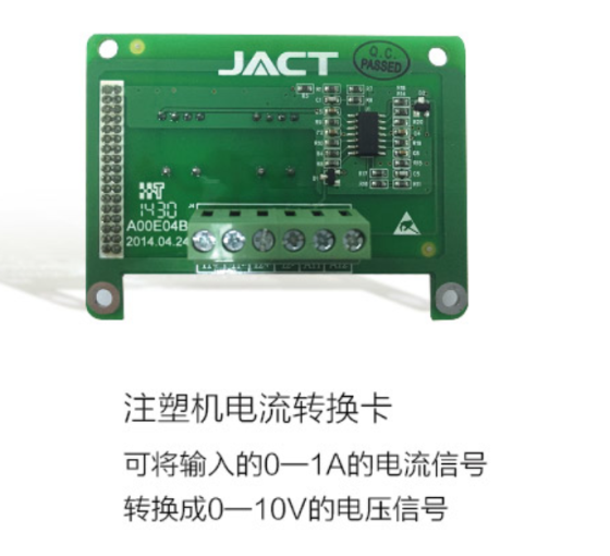 为了实现注塑机在变频调节时的最佳工况,我公司特别研究开发了针对注塑机压力、流量双信号控制的电流转换卡,它能根据注塑机各个不同工作环节的流量、压力要求不同可将输入的0-1A电流信号转换为0-10V的电压信号(图3),这样在加工一些高、精度的塑料产品时使用更是得心应手。