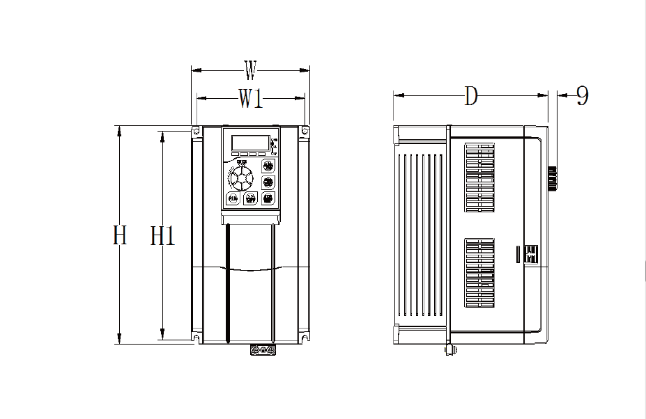 7.5KW以下塑胶外形尺寸及安装尺寸: