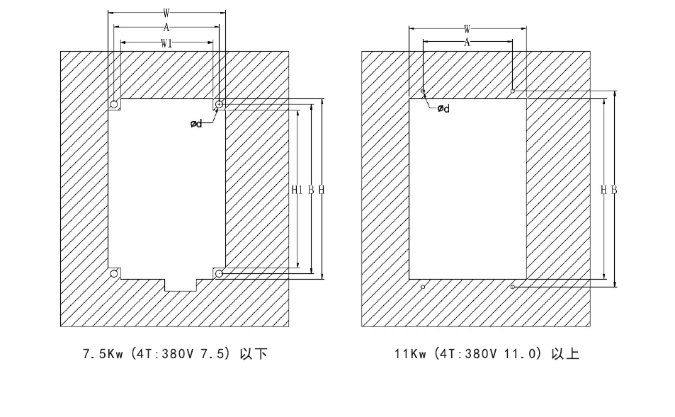 塑料结构变频器穿墙开孔尺寸/钣金结构变频器穿墙开孔示意图: