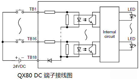 如果你使用的QX40 DC,请注意它是正极共用型(Positive Common Type)模块,其公共端为TB17(正极)。QX40DC的接线图与QX80 DC不同,如下:
