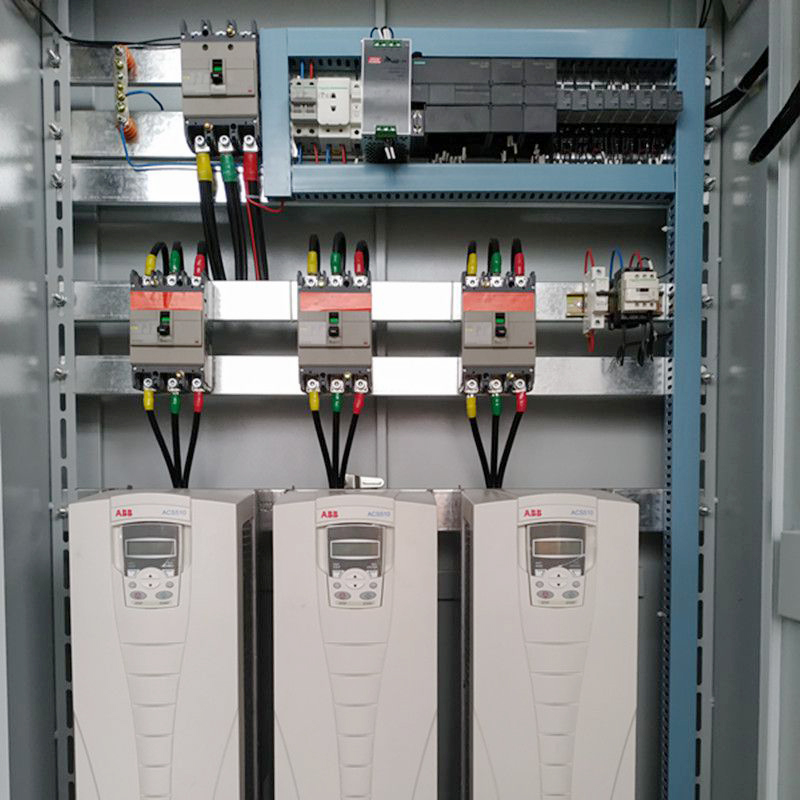 该智能变频控制柜由PLC,触摸屏,变频器及其它元器件组成能够实现恒压起动。触摸屏设定压力值PIC控制系统根据设定压力值调节相应电机的起停从而达到设定的压力值。维护功能全面,具有对电机的过压、欠压、过流、过热、缺相以及过载等保护。