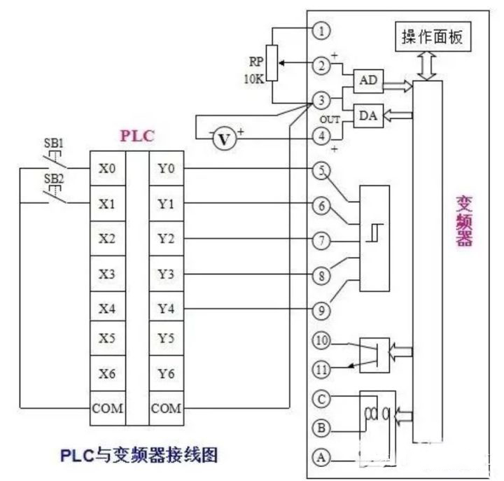 (1)利用PLC的模拟量输出模块控制变频器PLC的模拟量输出模块输出0~5V电压信号或4~20mA电流信号,作为变频器的模拟量输入信号,控制变频器的输出频率。这种控制方式接线简单,但需要选择与变频器输入阻抗匹配的PLC输出模块,且PLC的模拟量输出模块价格较为昂贵,此外还需采取分压措施使变频器适应PLC的电压信号范围,在连接时注意将布线分开,保证主电路一侧的噪声不传至控制电路。